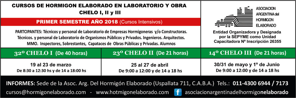 Cursos de Hormigón Elaborado en Laboratorio y Obra (CHELO I, II Y III) [MARZO 2018] Investigadores del LEMIT con amplia experiencia en la temática participarán, especialmente invitados, en el dictado de los cursos de la Asociación Argentina del Hormigón Elaborado. Los mismos están destinados a Técnicos y personal de Laboratorio de Empresas Hormigoneras y/o Constructoras. Técnicos y personal de Laboratorio de Organismos Públicos y Privados. Ingenieros. Arquitectos. MMO. Inspectores, Sobrestantes, Capataces de Obras Públicas y Privadas. Alumnos. Los citados cursos se dictaran en los laboratorios y Sede de la Asociación Argentina del Hormigón Elaborado (Uspallata 711, C.A.B.A.). Ver Detalles...
